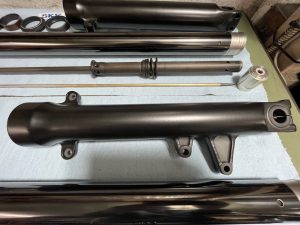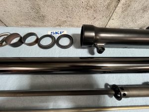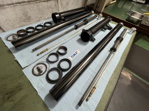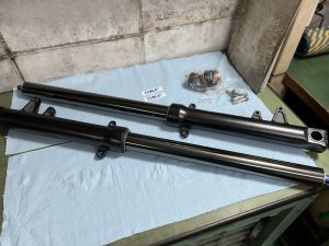 カスタマイズ, サスペンション, メンテナンス フロントフォークの各種コーティング 2025年10月30日 johnnys-factory CB1300SF(SC40)のフロントフォークです。 オーバーホールと同時に各部コーティングしました。 アウターチューブは下地バフ研磨してブラックカシマコート。 インナーチューブはDLCです。 中古のインナーパイプなので再メッキしてからダイヤモンドコートしています。 フォークシールはSKFですが、あえてブラックをチョイス!