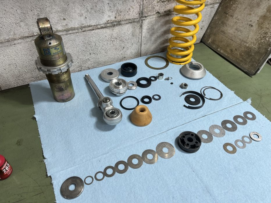 サスペンション, メンテナンス, 修理 Ducati(ドゥカティ)のSACHS(ザックス) ショック 2025年12月6日 johnnys-factory バンプラバーは劣化し欠損、オイルが漏れていました。 このタイプはオイル漏れしてしまうと・・・内部でガスピストンとショックロッドが接触して動作不良を起こします。 そうなるとマトモに動作しなくなるのでヤバい事になり、最悪内部がブッ壊れますので定期的にメンテナンスした方が良いです💦 バンプラバーが砕け散ったら要注意ですw