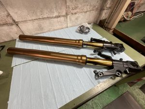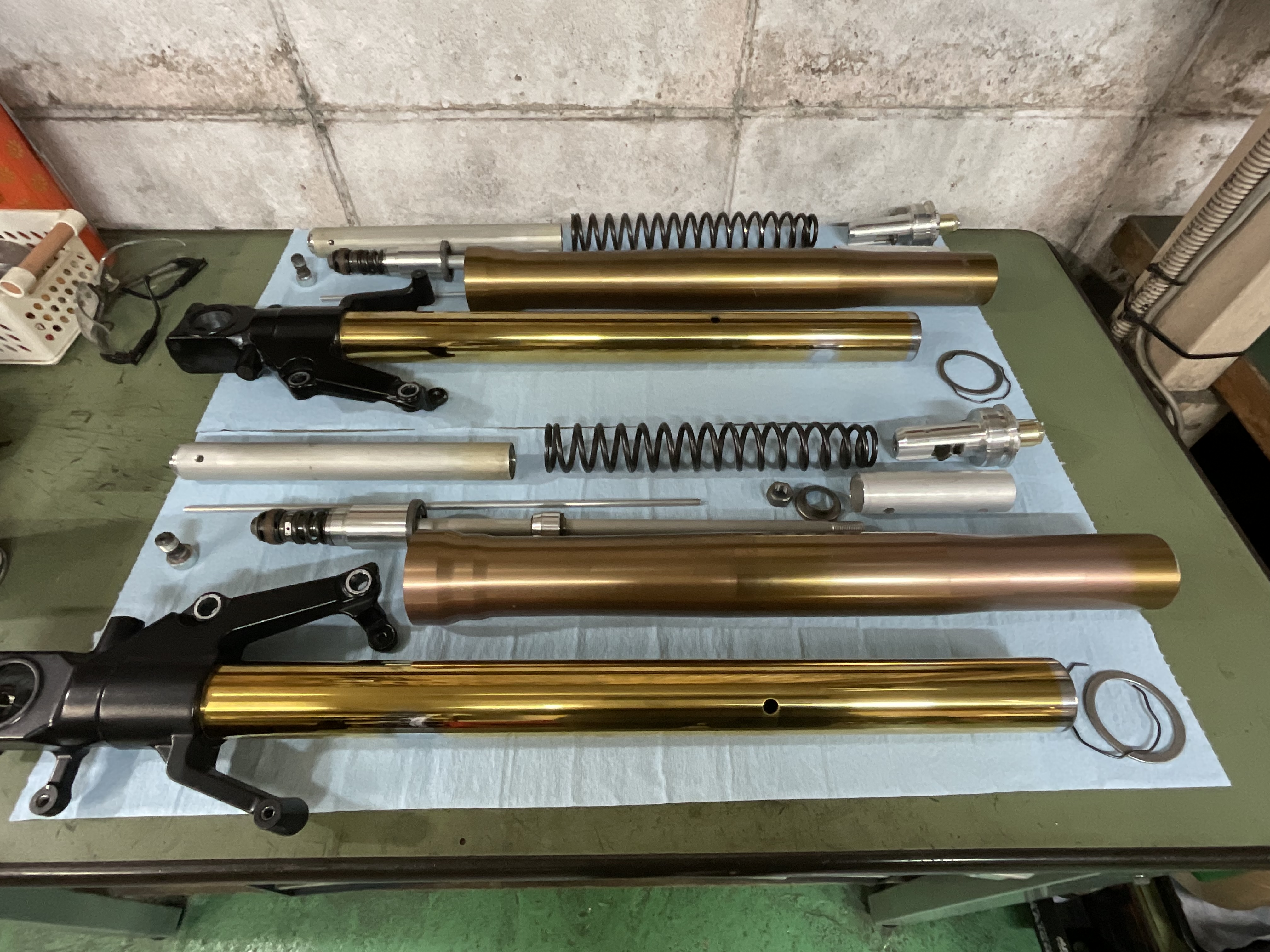 サスペンション, メンテナンス GSX1300R隼のフロントフォークとリアショック 2026年2月24日 johnnys-factory リアショックを外してみると・・・バンプラバーが砕けて中々ヘタっている様子。 ショックを完成させて・・・ フォークも完成です。車体に組み付けます